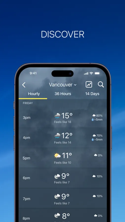 - Detailed weather forecasts including current observations and temperatures, short term (36 hours), long term (14 days) and hourly forecasts. These forecasts are updated every 15 minutes to ensure accuracy and reliability