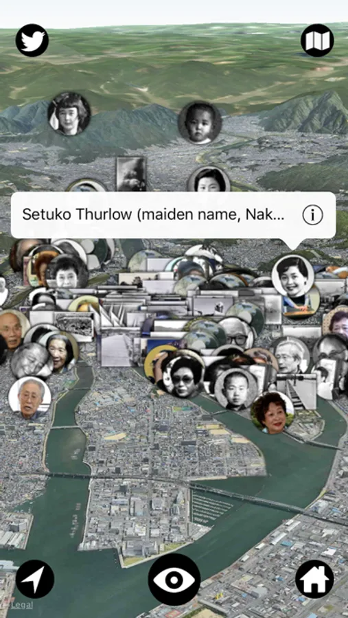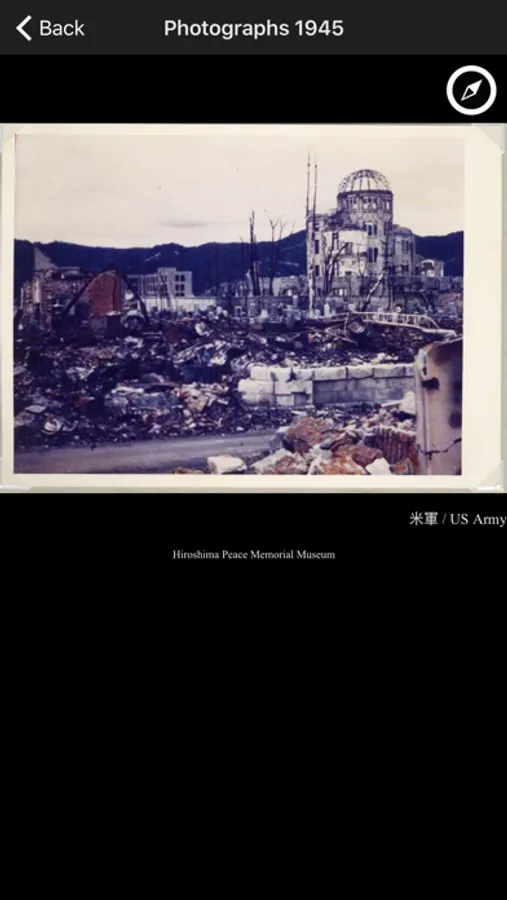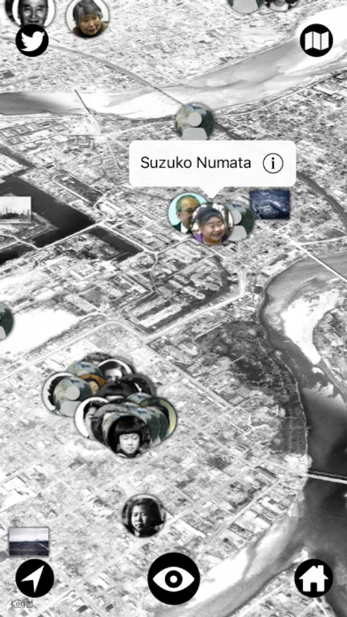 In the "Map mode", the data is displayed by markers on a 3-D map. And in the "AR" mode, the data of Hiroshima in 1945 is displayed as AR tags on the camera view.