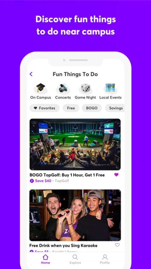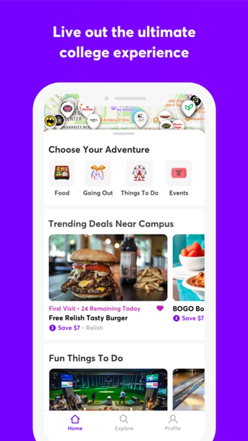 Find new deals at your favorite places around campus and get inspired to explore places you've never been in your college town. Discover hidden gems you didn’t know existed and find your new go-to spots for food, drinks and college memories.