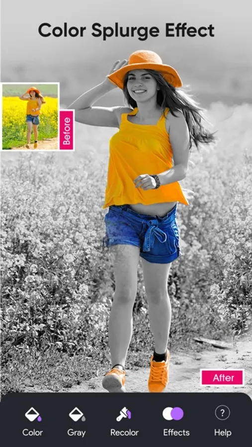 Color Splurge is a photo editor thats Lets you Selective De saturation(Popularly known as selective coloring and recoloring Effect) and Colorize your photos and generate high quality images.No matter how big is the image it lets you generate the High quality output.It is fully integrated to social networks like Facebook.