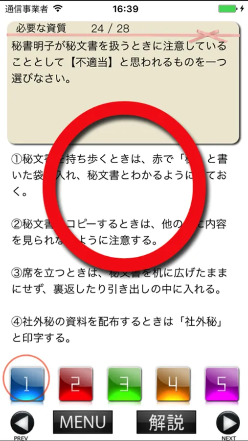 ・秘書検定2級、3級の過去問を分析し、傾向を踏まえて本番と同じ5択で出題しています。