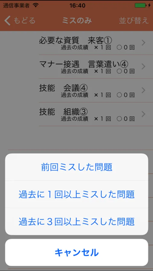 ⑧ ミスのみ 間違った問題だけ出題。ミスの回数で抽出できる。
