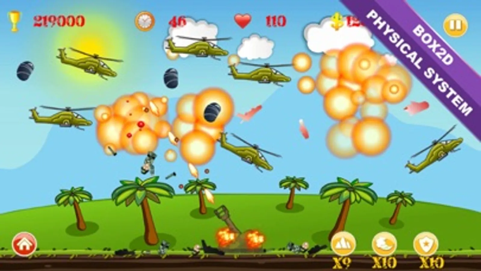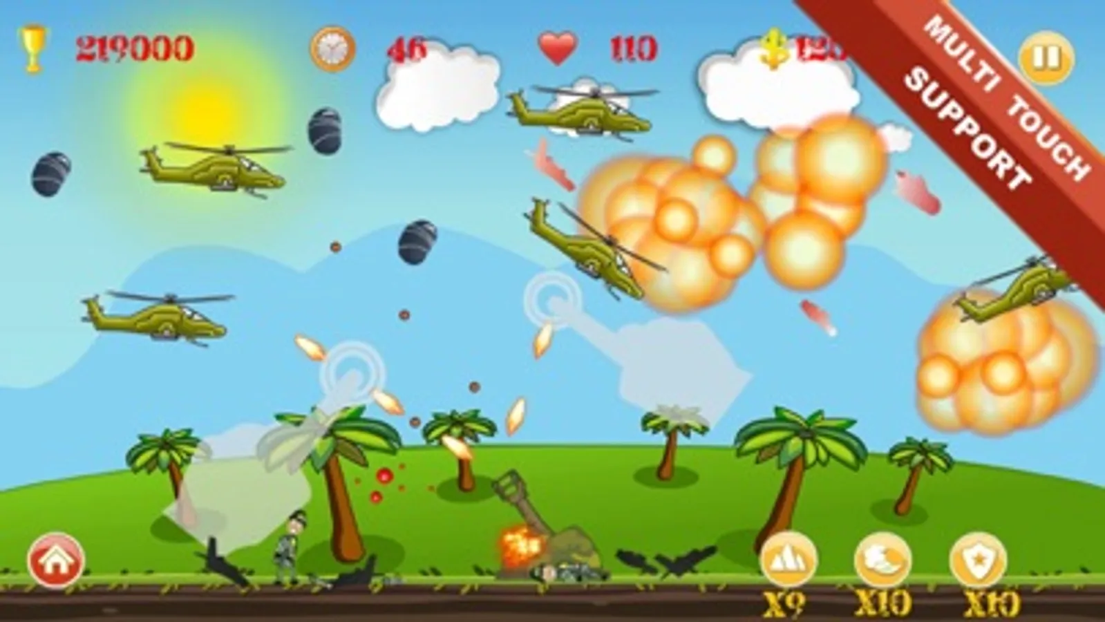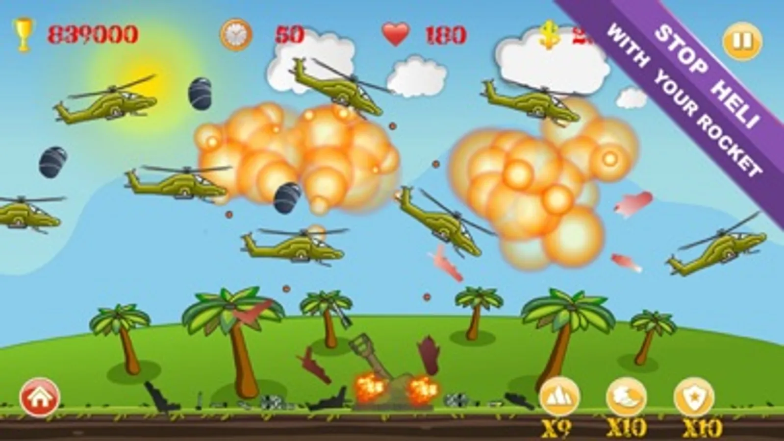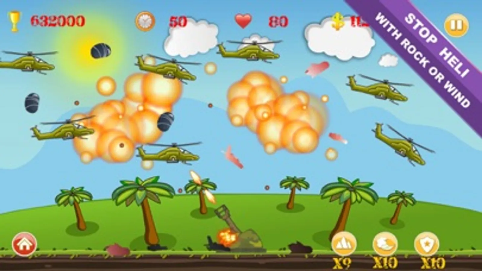 HeliInvasion - Survive waves of invading hostile helicopters! Shoot them with your cannon, rocket, rock, wind, and try to make them rotate until they explode. Let them knock into each other to create massive chain reactions of explosions! Earn money with each exploding helicopter to repair and upgrade your cannon.