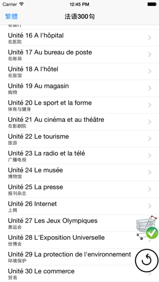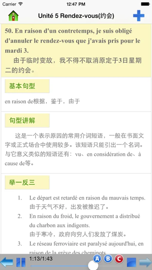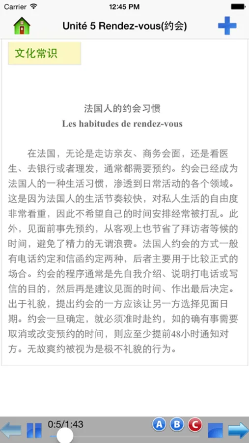 法语300句内容丰富生动、实用性强,从语言、文化、思维模式三个层面向读者提供了极有价值的信息,能迅速提高您的口语水平。该应用共有30单元,每单元有10句组成,每单元包括一个“文化常识”。每句话包含“基本句型”、“句型讲解”、“举一反三”三部分组成的。是用户学习法语或练习法语的好帮手。