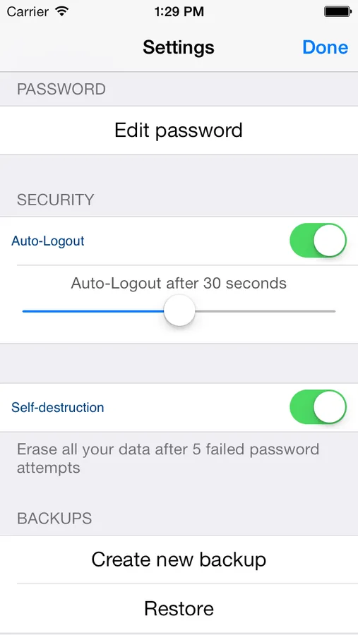 - Self-destruction of data when the app detects unauthorized access attempts to your data, due to loss or theft of the device.