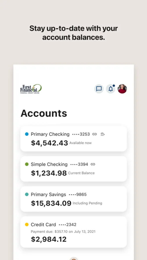 • Enjoy shared account access: view other First Financial shares and loans that you are associated with, all with one login.