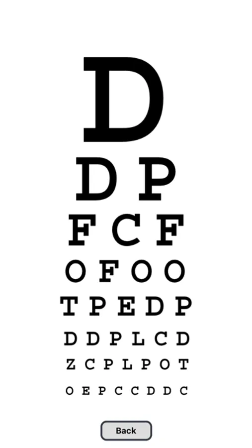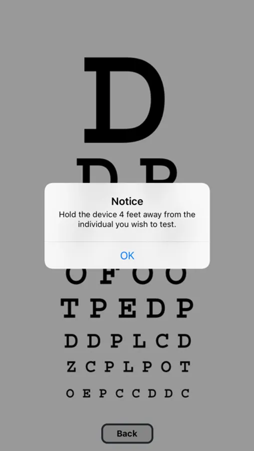 Stand the individual 4 feet away from the device and ask them to recite as many letters as possible. 1 of 3 random charts is selected to ensure charts cannot be memorised.