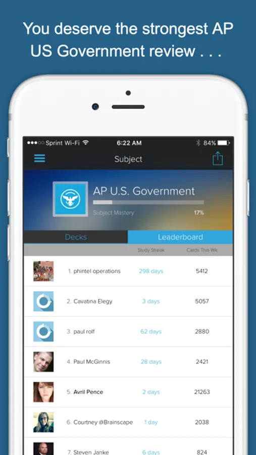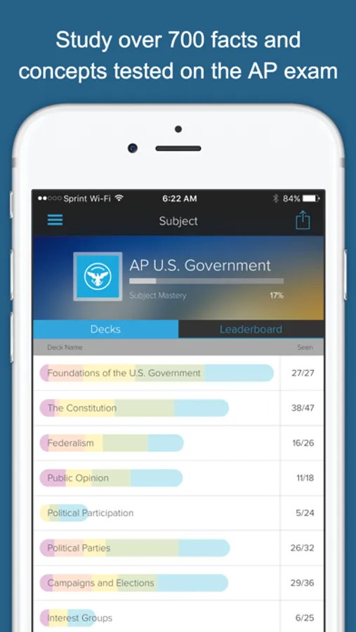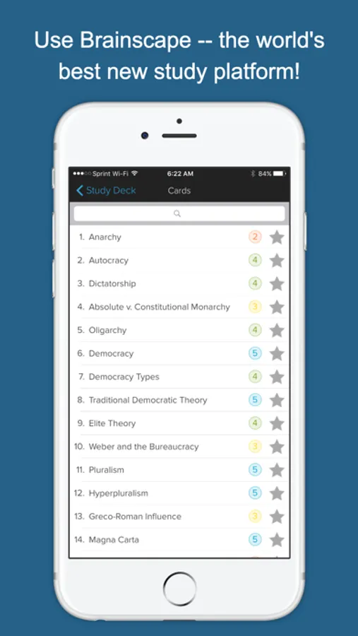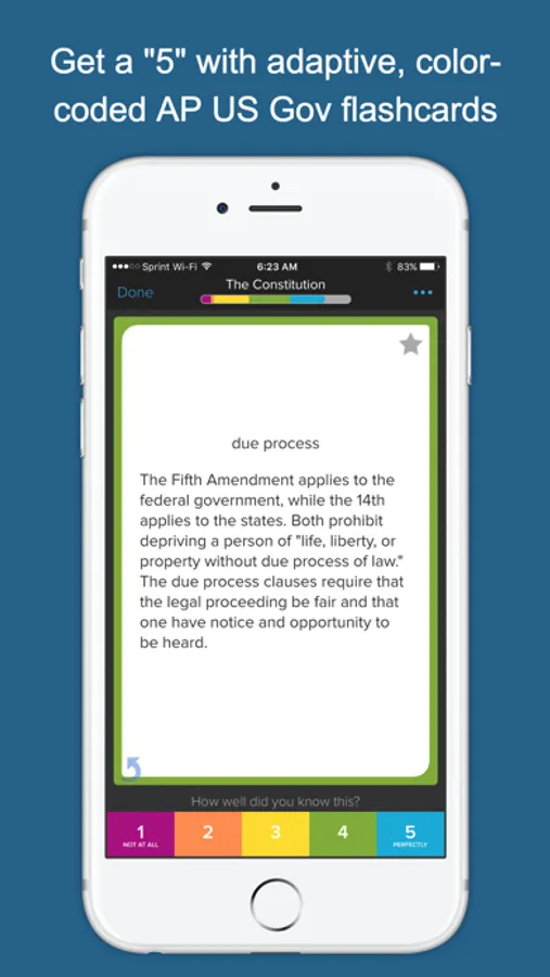 Brainscape’s 600+ dynamic flashcards, covering the foundations of American government to modern foreign policy, present a highly effective, efficient, and fun way to study for one of the most demanding AP courses you will take. We have ensured that we cover all the fundamental material from the College Board’s AP U.S. Government topical outline, so you know you are covering all your bases! What's more, this app is more than just a set of facts and definitions; we also present the context and significance of the events and decisions we describe.