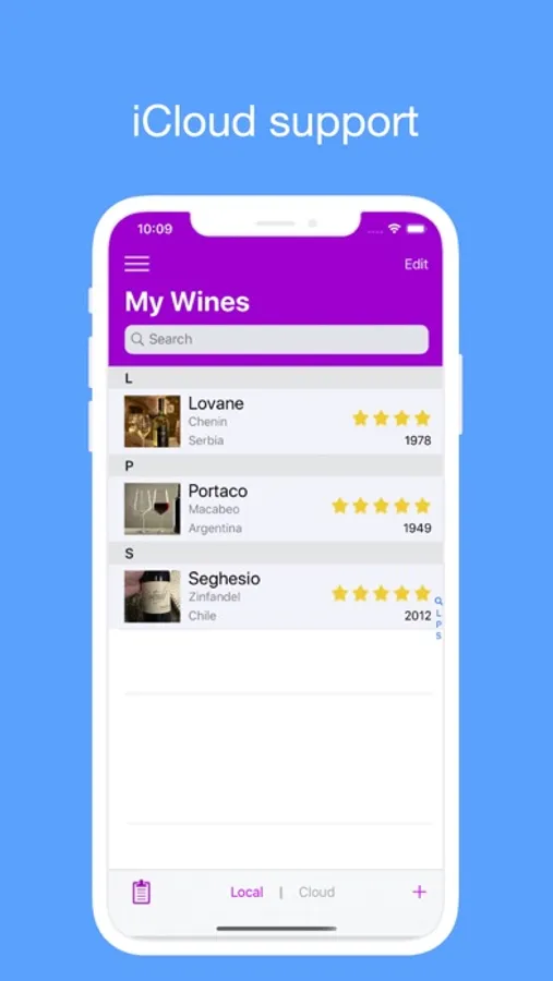 • Storage of photos, properties (12), ratings (5) and notes for each wine