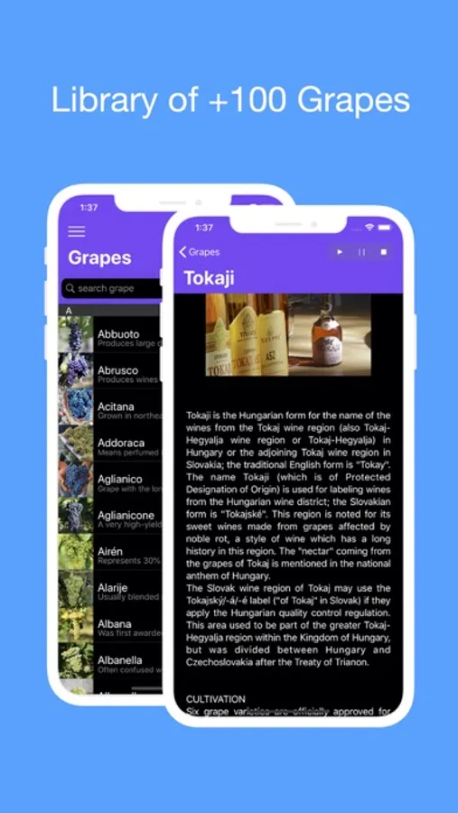 • Detail views for each type of grape with a complete overview, beautiful photos, text to speech and font size of your choice