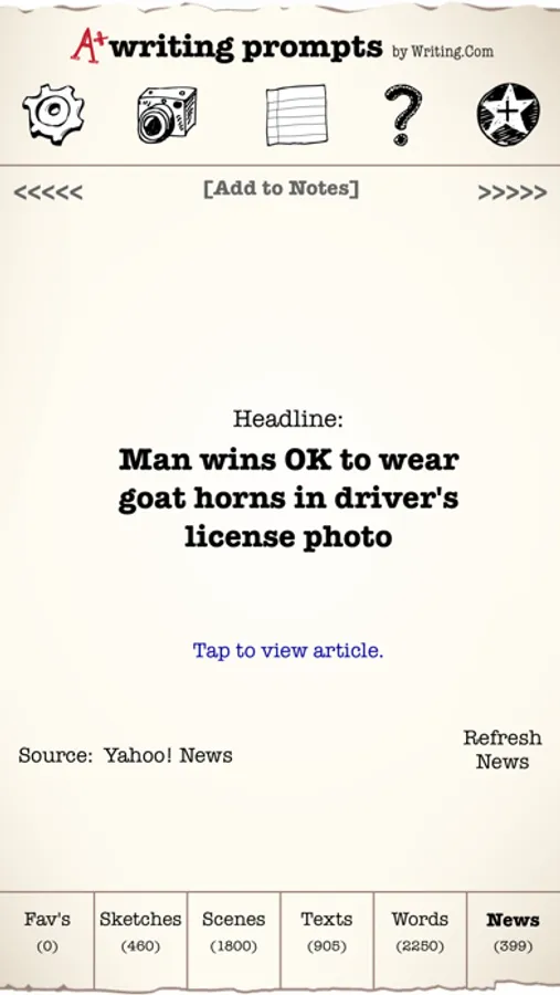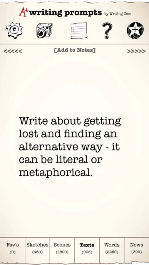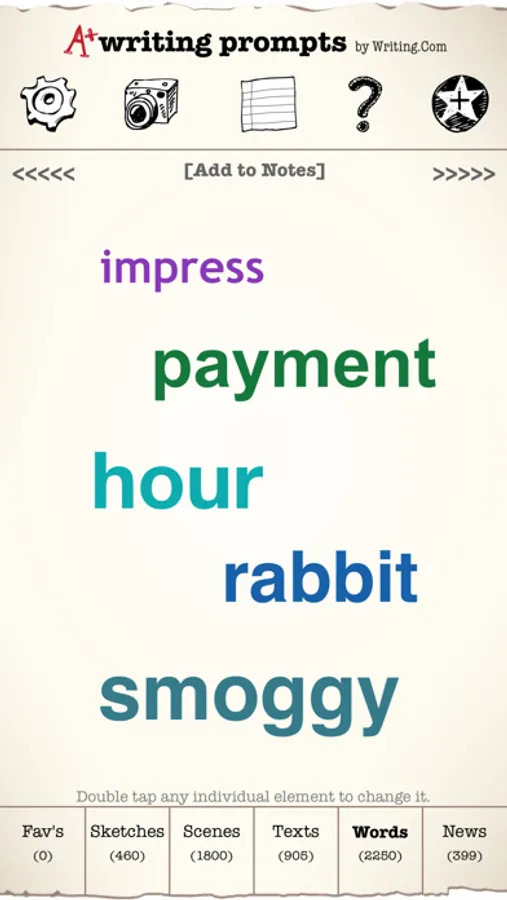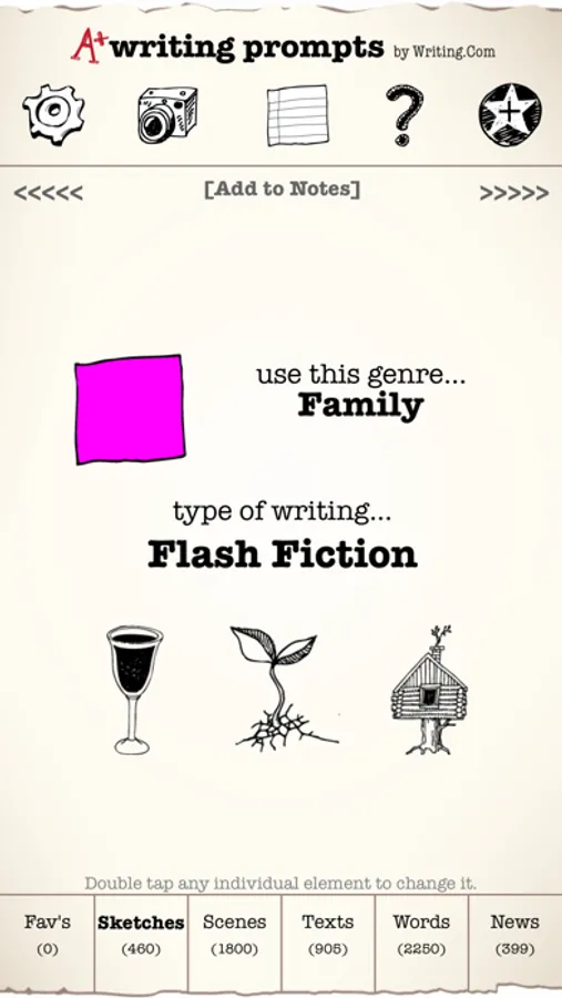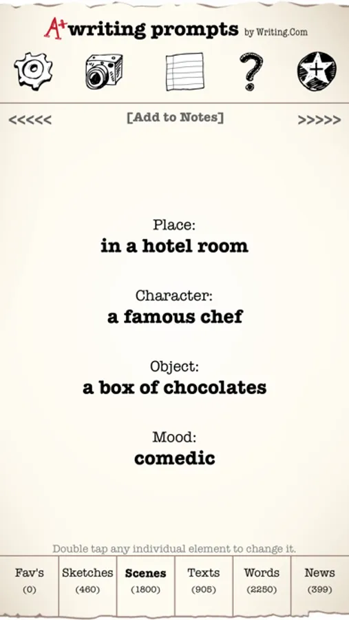 ** Five prompt generators: Scenes, Sketches, Texts, Words and News. Store your favorite prompts into the "Fav's" tab by tapping the favorite star on any prompt.