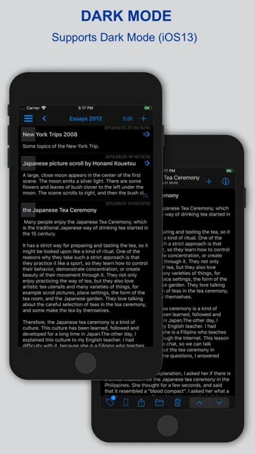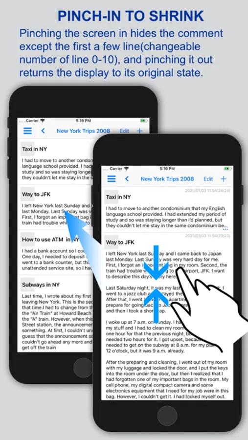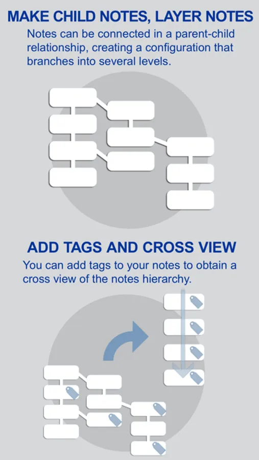 You can move between a parent note and child notes by swiping left or right a note. In addition, notes are shrunk by pinch-in, then the title and the first few lines of the body (from 0 to 10 can be set) are displayed. Pinch out to return. These operations can also be performed by tapping the button on notes.