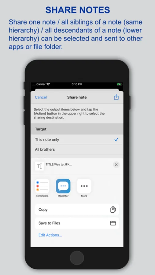 - Thread mode: one note / all siblings of the note (same hierarchy) / all descendants of the note (lower hierarchy)