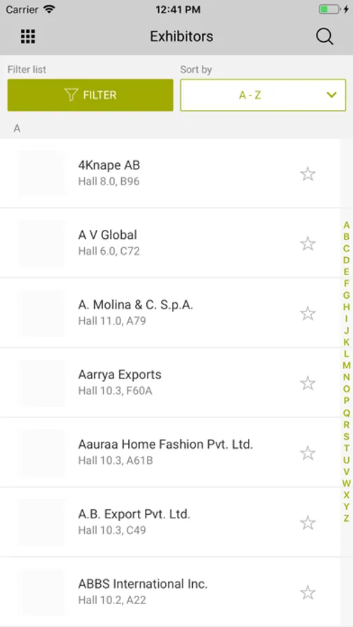 Exhibitors: search for companies and products, filter and sort functions available, also find contact persons ad exhibitor events. Add Photos and Notes to an exhibitor and share them.