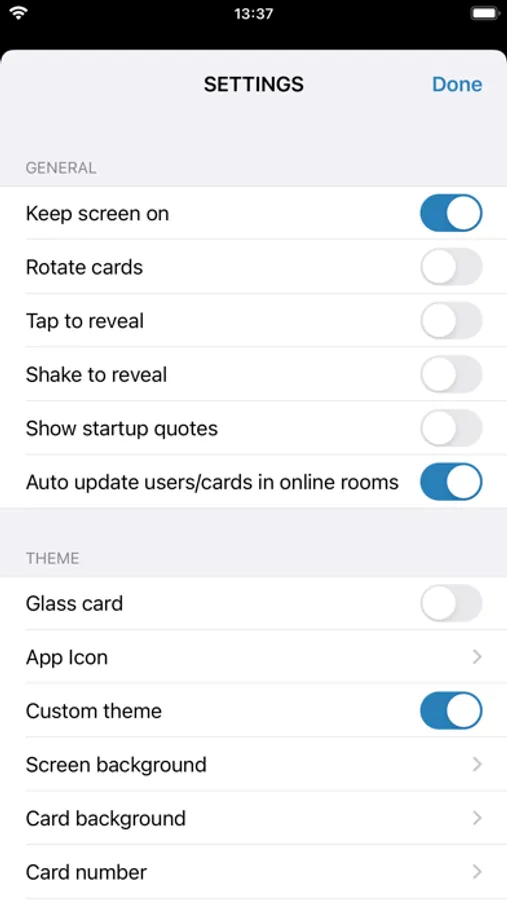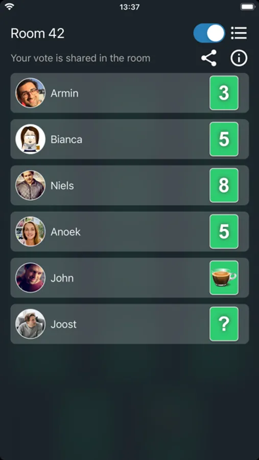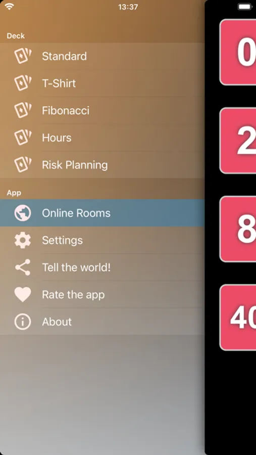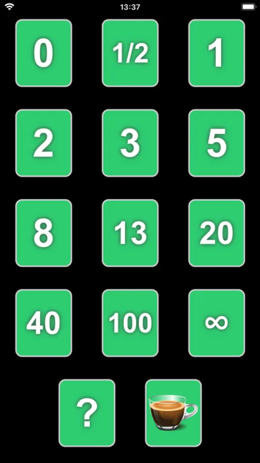 This app can be used in scrum poker planning sessions anywhere. Meeting rooms, living rooms, kitchens, trains, ships, under water, outer space, you name it! It includes the standard numbers, Fibonacci, T-Shirt sizes, standard Hours and the business-special Risk Planning cards, along with infinity and the coffee cup card.
