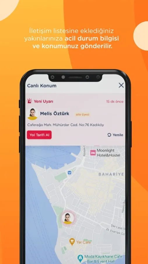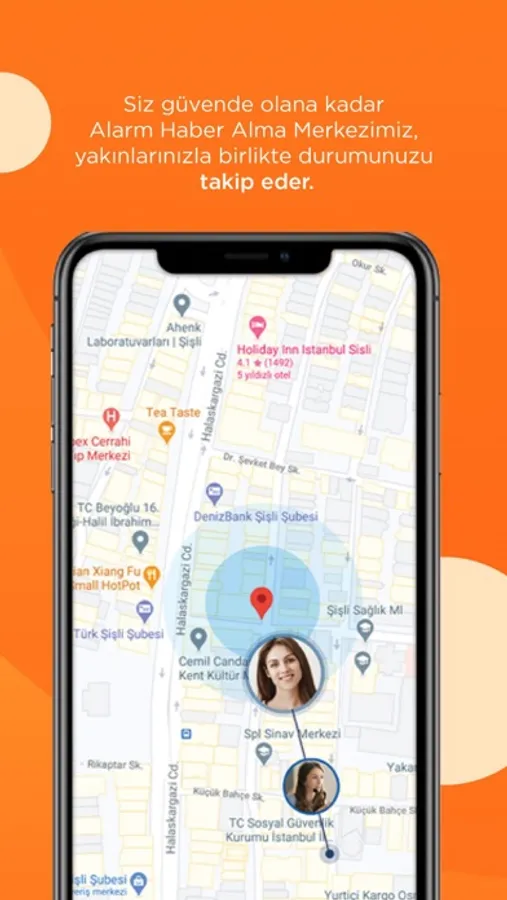 Ø Panik butonuna bastığınız anda, uygulama içindeki acil durum kişi listesine eklediğiniz yakınlarınıza, SMS ile acil durum bilgisi ve lokasyonunuz gönderilir. Uygulama kullanan yakınlarınız konumuzu canlı olarak haritadan takip edebilirler.