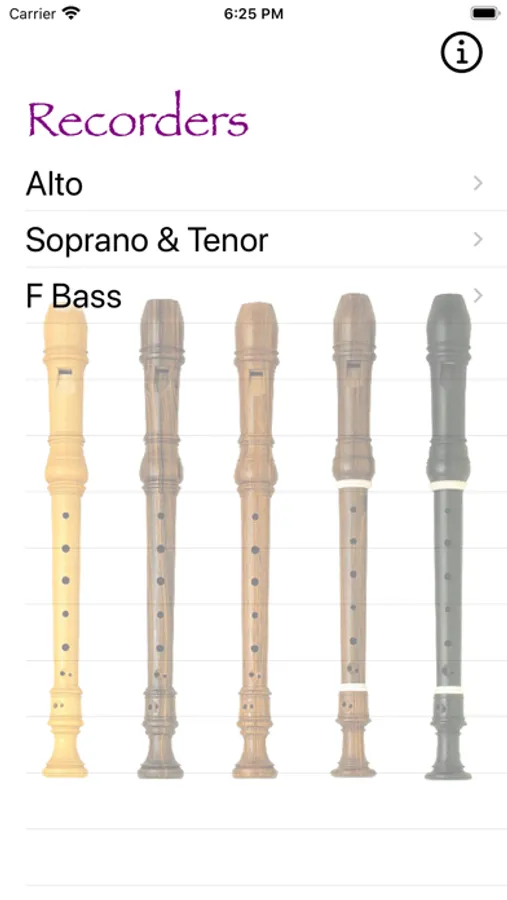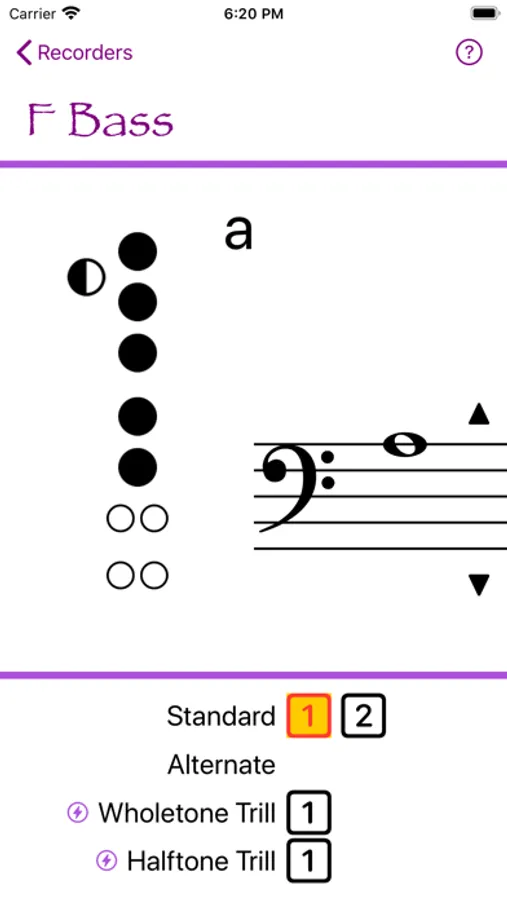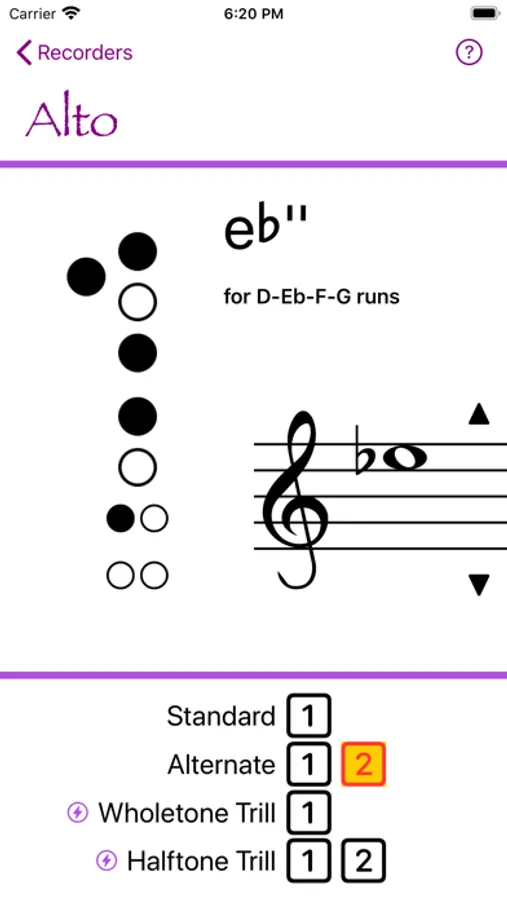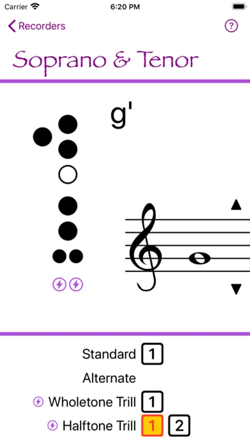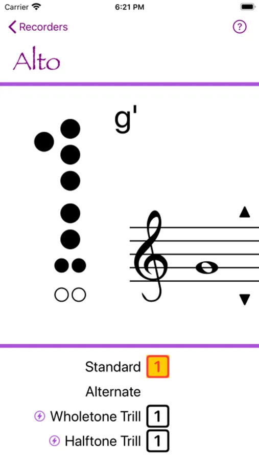 To use the app, you first select a recorder type. Then select a note by touching and dragging over the staff and/or hitting the arrows. For chromatics you must use the arrows. Then for each note you can touch a button for the basic, alternate or trill fingerings.