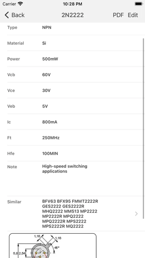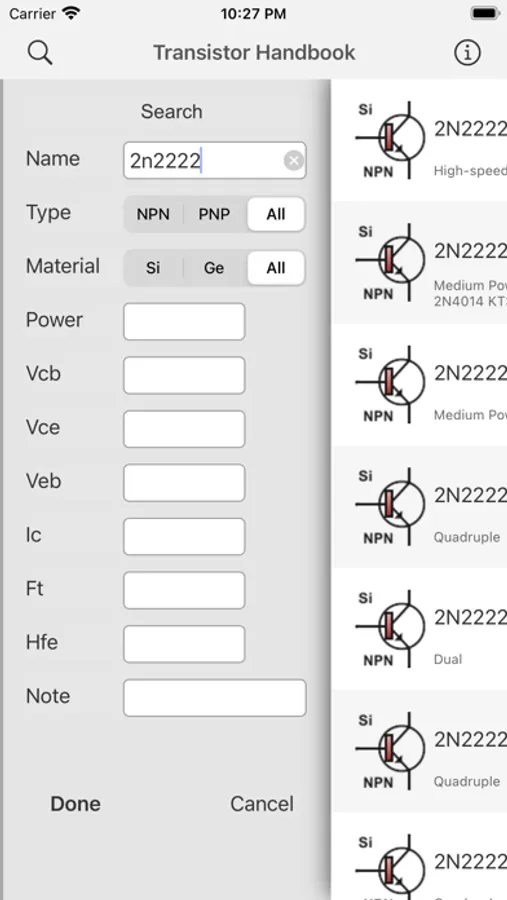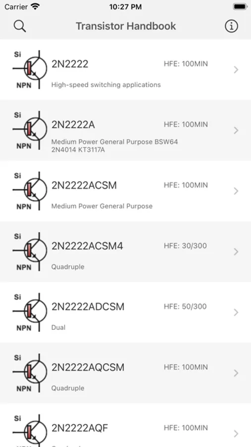 With Transistors Handbook you will se the design, the kind and all the aspects of more than 51.000 transistors, the application will provide the following info: