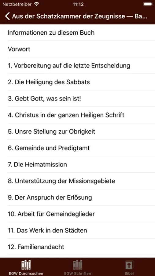 Einfache Navigation in der EGW Bibliothek durch scrollen durch die Liste der Titel, Auswahl des Buches und dann des Kapitels