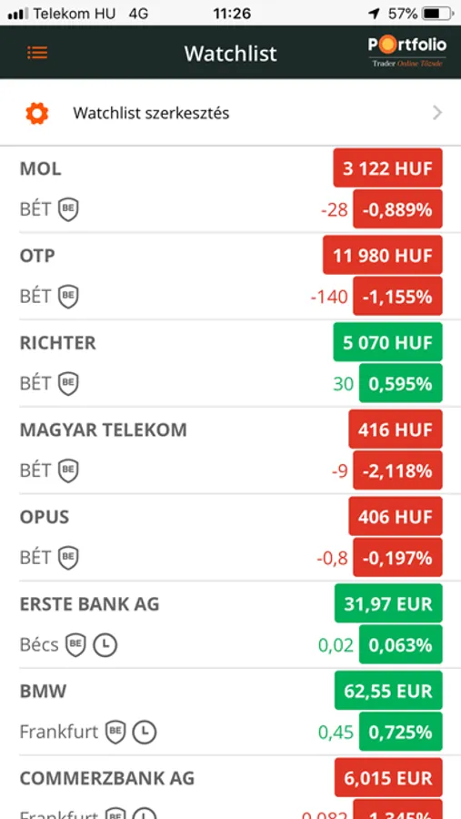 The Portfolio Online Tőzsde GO application lets Portfolio Online Tőzsde online brokerage service users to trade via mobile whenever they like. Portfolio GO enable customers to follow the market (prices and news), to read research materials and also to buy or sell instruments on the BSE, XETRA Frankfurt or Vienna, NYSE, NASDAQ.
