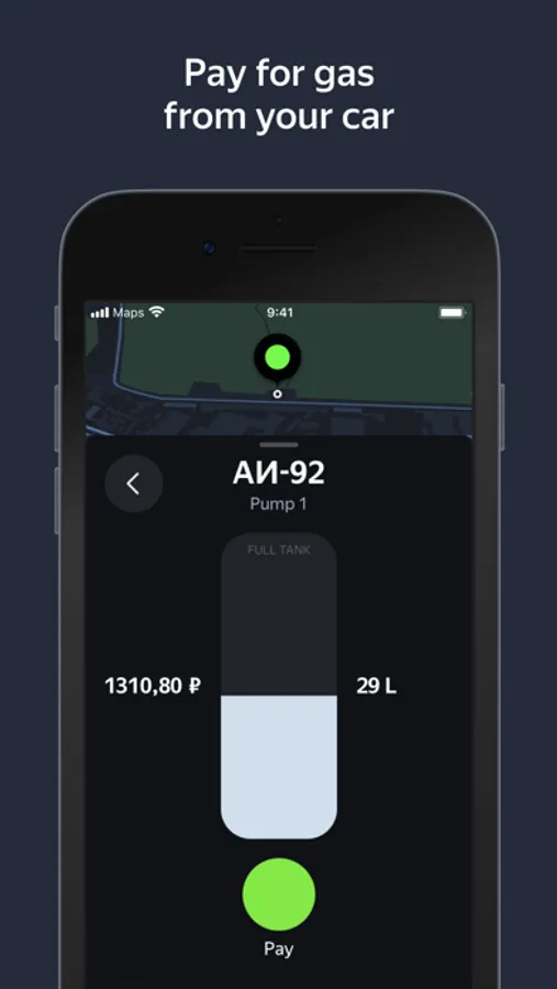 Choose your fuel type, select how much you need, and pay for it without leaving the app. Just tap the fuel tank button, and you'll see all nearby gas stations along with their available payment options.