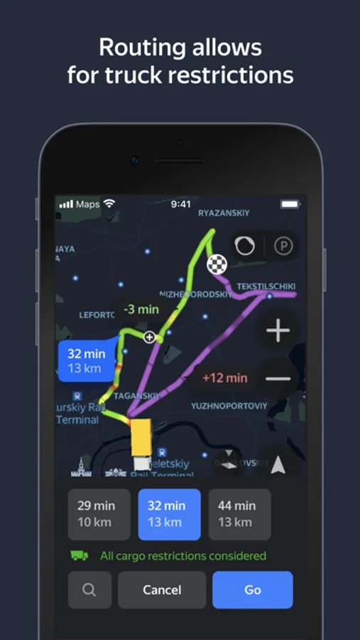 If you're driving a truck or other freight vehicle, select "Add truck" in the app settings and describe your vehicle's characteristics. Yandex Navigator will get directions that account for any weight, size, or emission limitations.