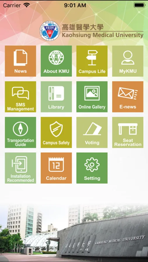 5.MyKMU:提供成績查詢、課表查詢、場地查詢。