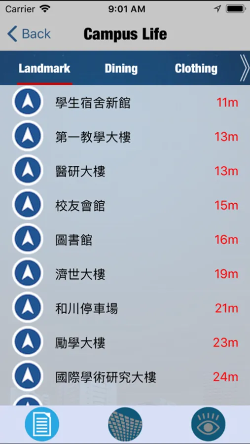 3.校園導覽:提供地圖導覽與擴增實境導覽兩項功能,認識校園地標、建築物及校園周邊食衣住行育樂資訊。