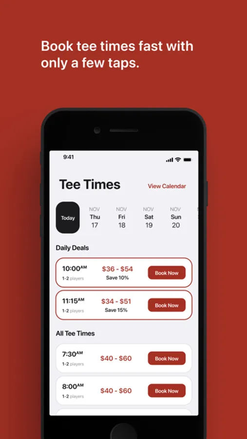 Booking a tee time is as easy as 3-taps and once you've setup your account the app will remember you so its always 3-taps. You can always look up your reservations and cancel reservations if you need to as well. Plus view and redeem your rewards or promotion codes anytime.