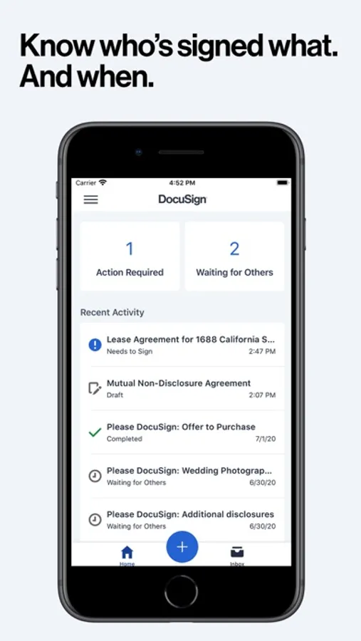 • Manage signing on-the-go. Remind, void, in-person signing, and reusable templates.
