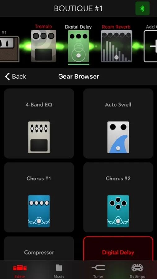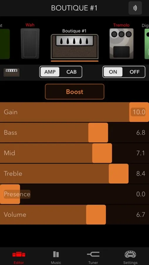 • Create, edit, and save your favorite custom guitar tones