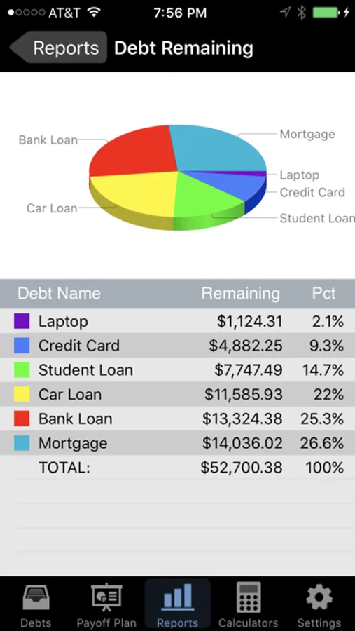 - See your total debts, debts remaining, total interest paid, total interest saving, debt payoff date, and debt payoff time savings via charts and reports.