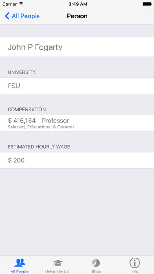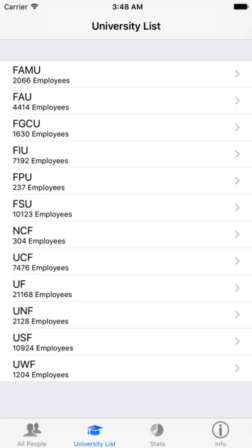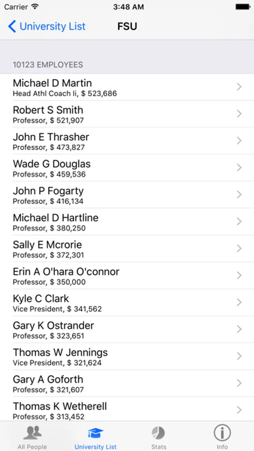 This app provides the salary information for ANYONE working at one of Florida’s 12 state universities! Find out how much your professors, coworkers, and deans make. Make sure to check out the top 100 list of top earners!