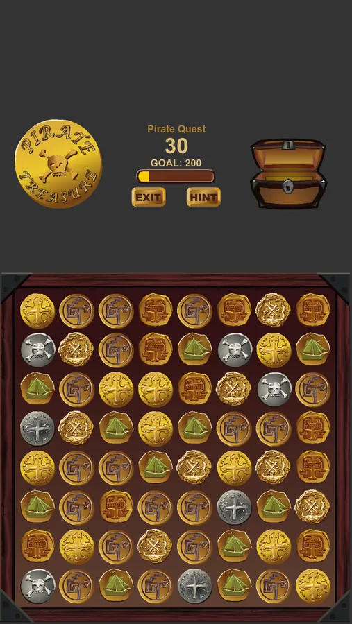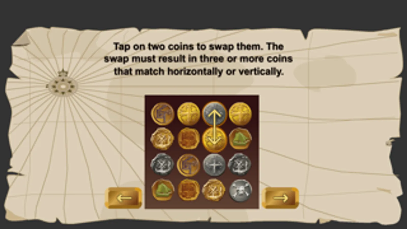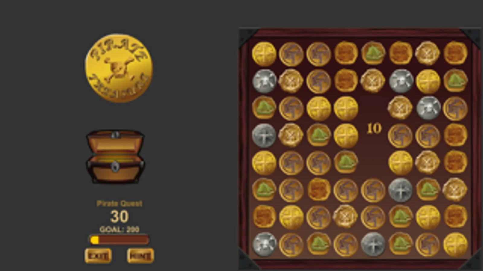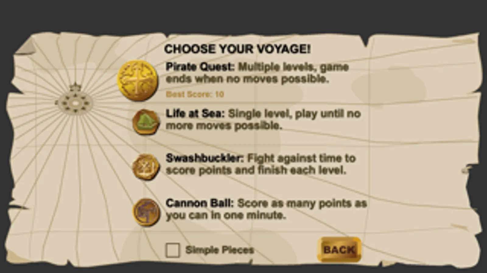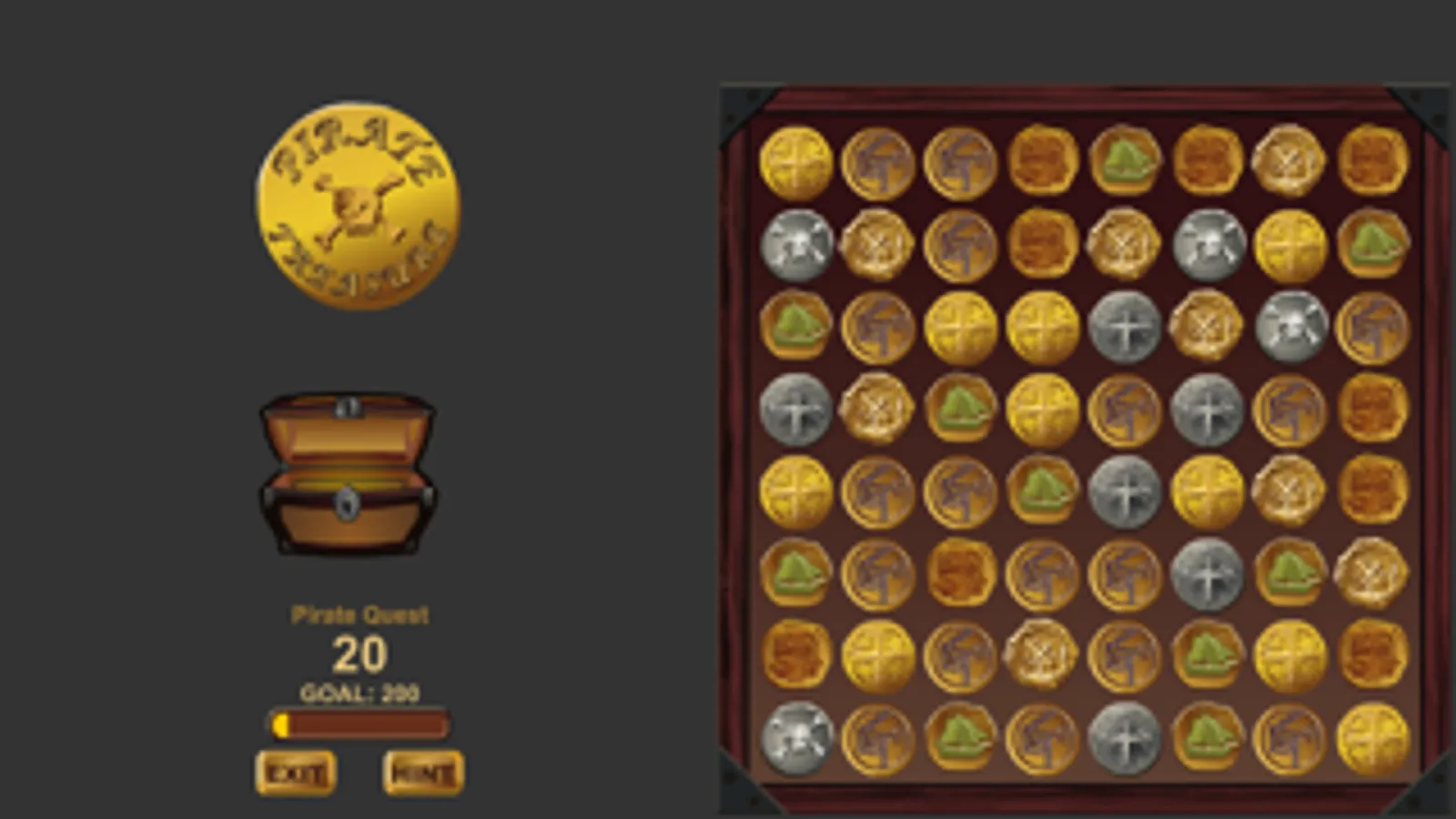 Avast, me hearties! Time to claim your treasure! All ye need do is to match three coins in a row to add them to your loot! This be a buccaneer's version of the classic match three game. Fair winds will bring you special bonuses when you make multiple matches. This here game includes four scurvy-preventing variations: Pirate Quest, Life at Sea, Swashbuckler and Canon Ball. So heave ho and hoist the mainsail!