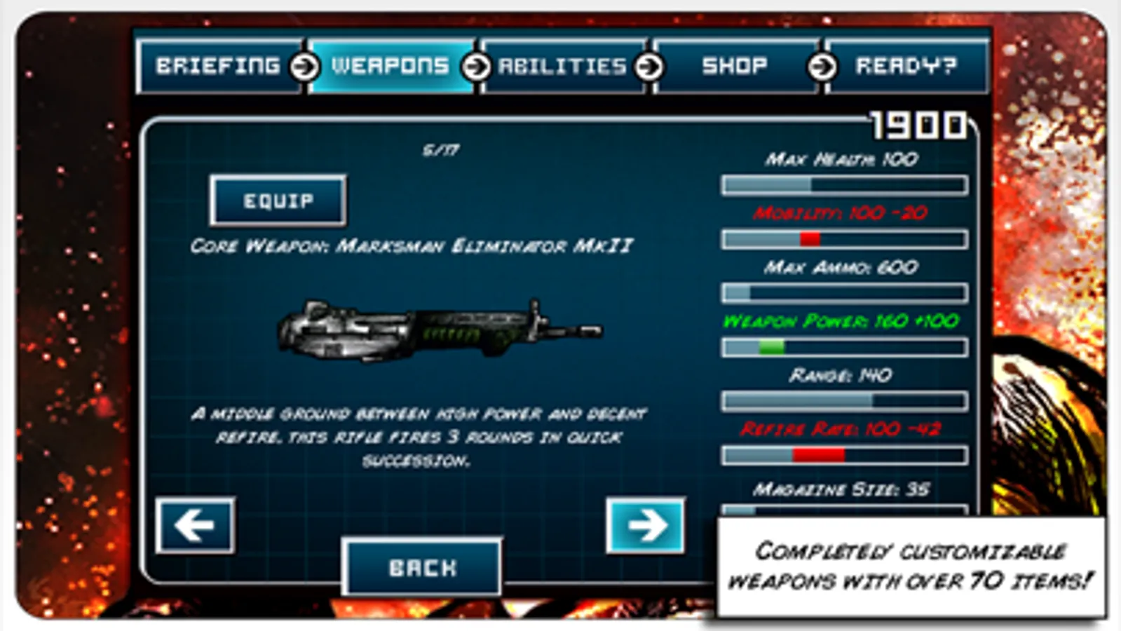 There are over 70 different items and components in the game with which to do this; including 17 core weapons which range from standard rifles to flame-throwers and rocket launchers: Make a fast firing sniper rifle with exploding rounds or a deadly powerful shotgun with a bayonet for close encounters!