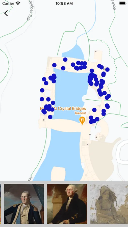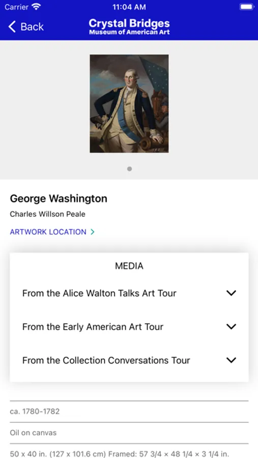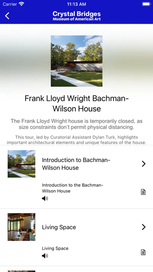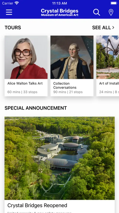 The Crystal Bridges app features a selection of audio and video tours of the museum's permanent collection, arranged around a variety of themes. There is also a "near me" feature that alerts listeners when they are near a featured artwork in the gallery.