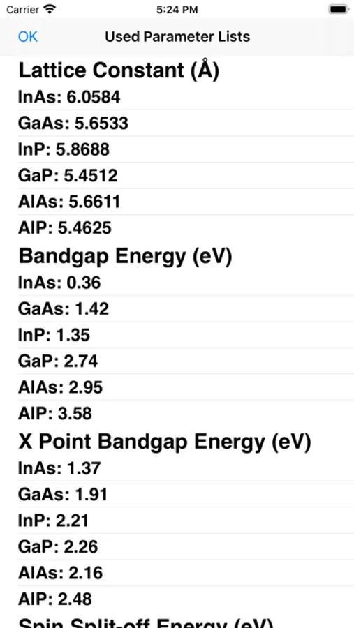 The following properties are shown as a result: compositions (x, y, z), lattice constant, strain, bandgap, relative energy positions of the conduction and valence bands, and effective masses of the electron and holes.
