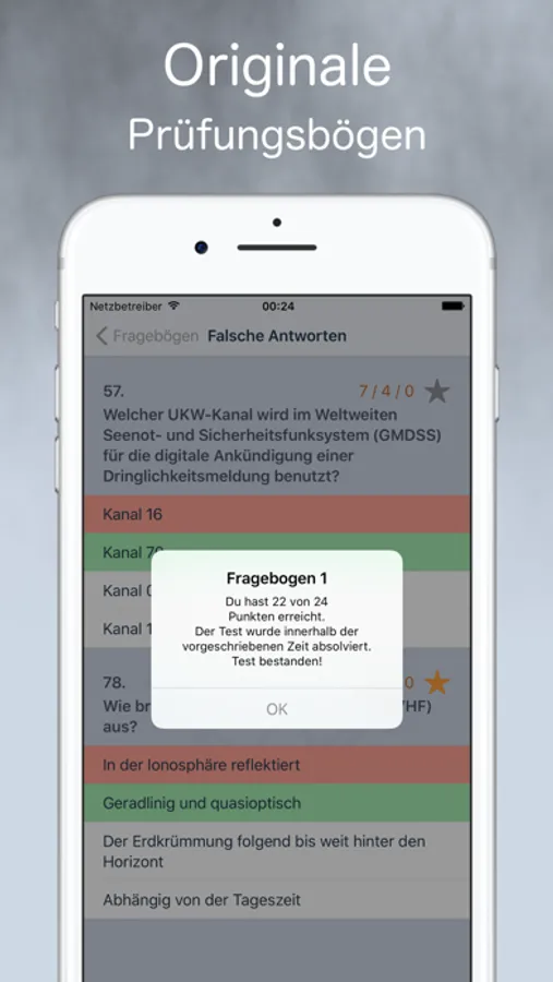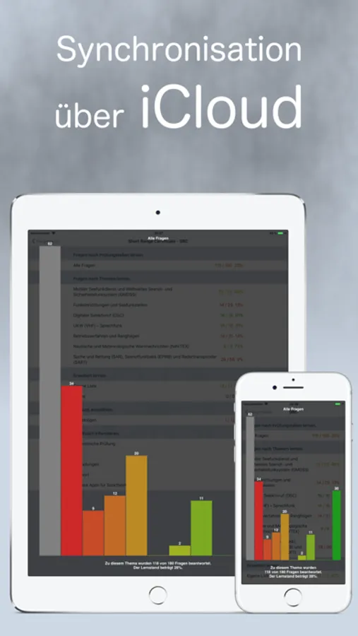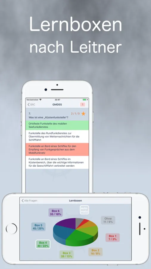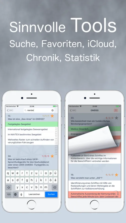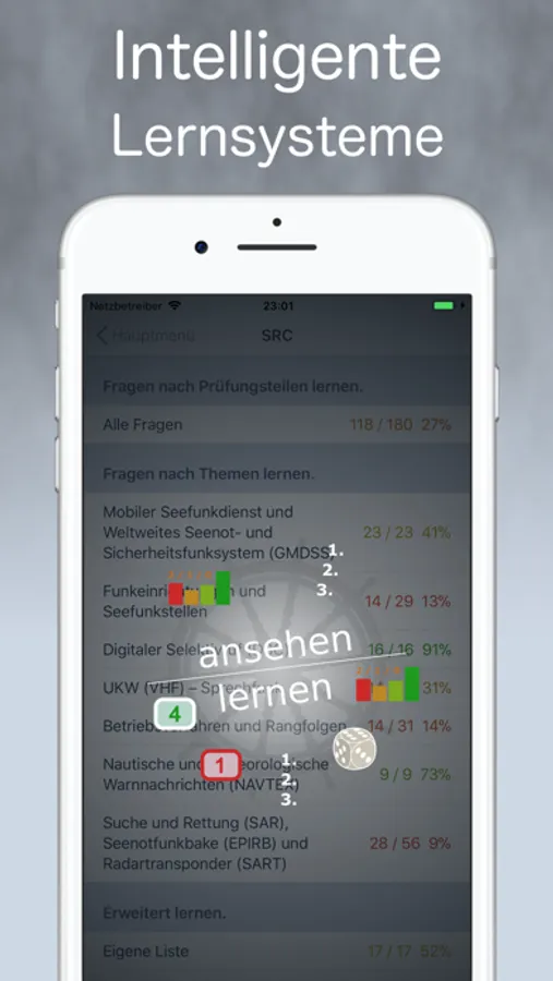 • Die graphische Statistik und Kurz-Statistik zeigen dir jederzeit den Lernstand zu einzelnen Fragen, den Fragebögen, den Seefunktexten oder ganzen Themen. Wenn du willst farbig. Rot - da musst du nochmal ran ... Grün - das sitzt schon. Du weißt also immer, wie du stehst.