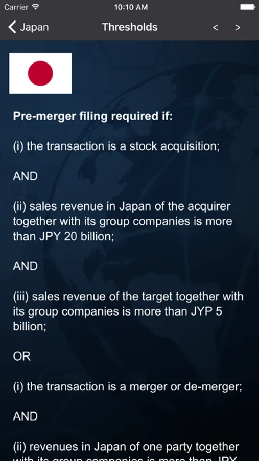 The Global Merger Regimes™ Application provides access to the main contents of merger review regimes around the world. This information is critical in the M&A process, as transactions may require approval from competition authorities around the world. Users have simple access to applicable national filing thresholds, timeline to clearance and additional useful information relating to merger regimes around the world.