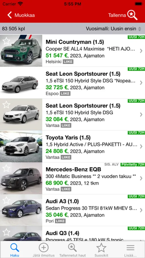 • Näet listalta suoraan montako tulosta haku sisältää ja kuinka monta uutta/muuttunutta edellisen hakusi jälkeen on tullut