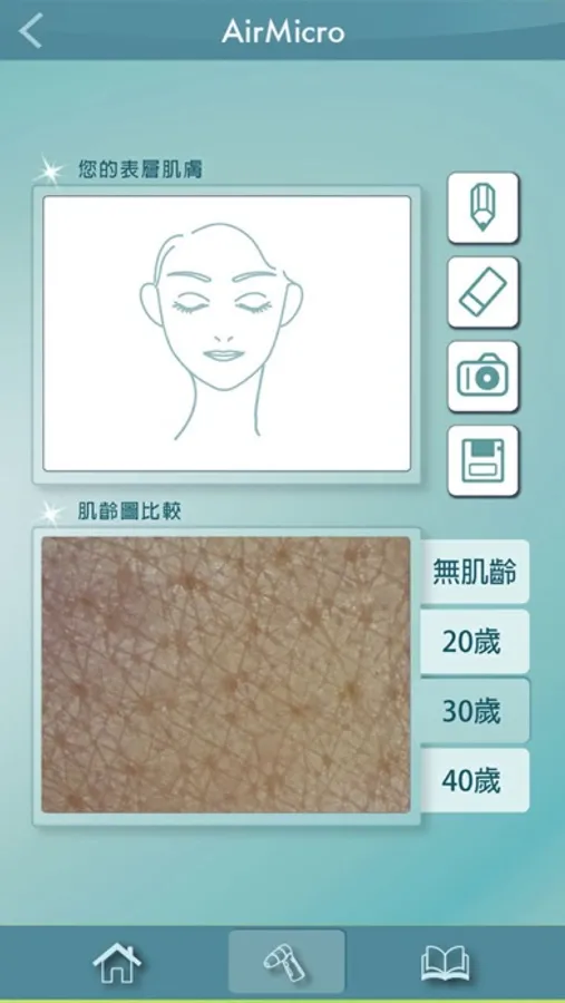 能直接判斷肌膚油性、乾性、過敏性等問題,進而了解肌膚健康與否,此程式還提供表層肌齡比較圖與深層肌膚對照圖,作為檢查肌膚老化及健康狀況之依據。此外也提供肌膚水分檢測功能與日常保水資訊。