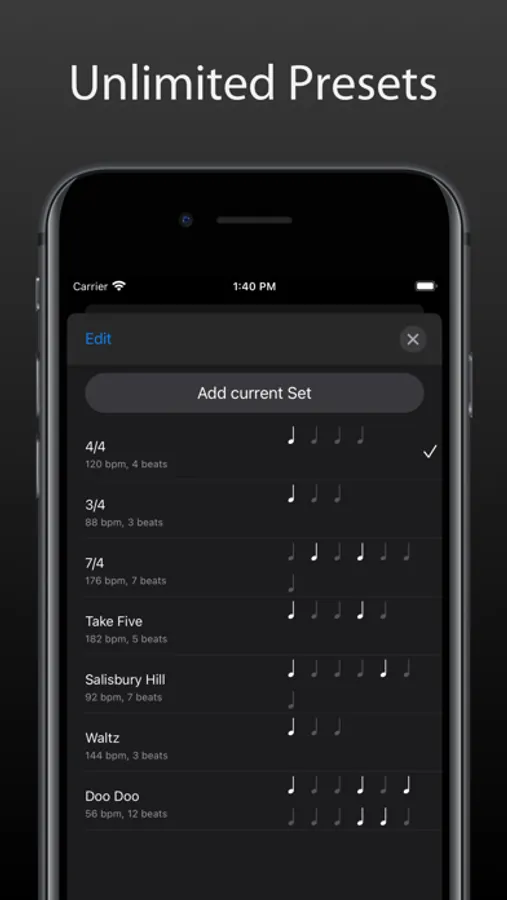 There is an infinite number of customizable presets to save your favorite sets of bpm, time signature and accentuation.