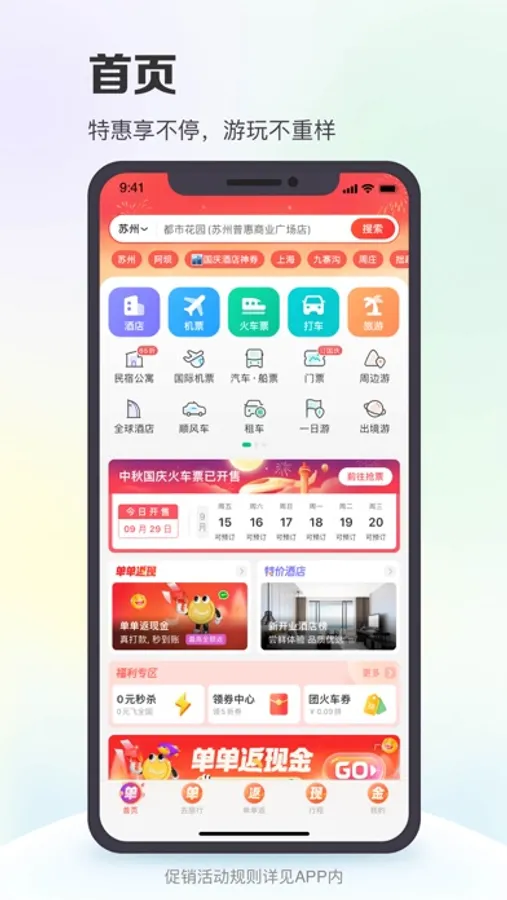 9、本地玩乐:一站式工具--扫码乘公交、打车、顺风车、拼车;本地酒店、景点门票、度假周边游一日游、团购美食;附近商品推荐、达人种草,助你快乐每一程。