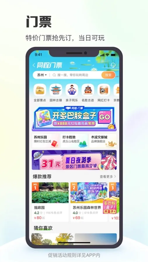 5、门票:全国海量景点优惠订,特价门票5折起;极速出票快乐游,免票入园不排队,无忧退订有保障;支持在线预约,无接触式购票安心游!