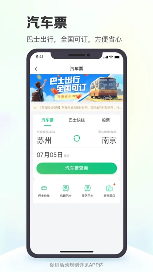 7、汽车票:支持全国汽车票线上预订,可在线退改,更享购票九折优惠!