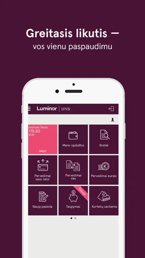 Manage your finances fast and easy. The Luminor mobile bank app is designed to make all your daily banking services as easy as can be, with lots of useful features accessible in a blink of an eye. Also, forget about code generators and card codes - all you need after the first log-in is the 4-digit PIN code that you created yourself.