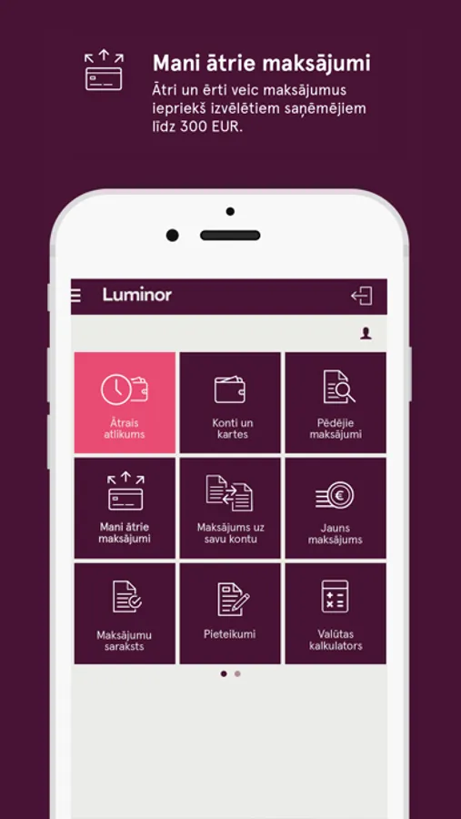 • Ātri un ērti veikt maksājumus iepriekš izvēlētiem saņēmējiem līdz 300 EUR (1000 EUR dienā)