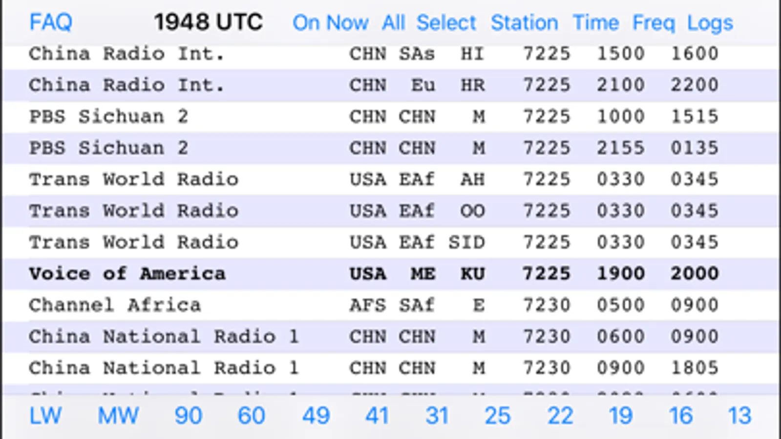 The stations are initially listed in order by frequency. You can tap a button to see which stations are on the air right now, as well as search for stations by name, frequency, time of day that they are on, or select by language, target area, or country of origin.