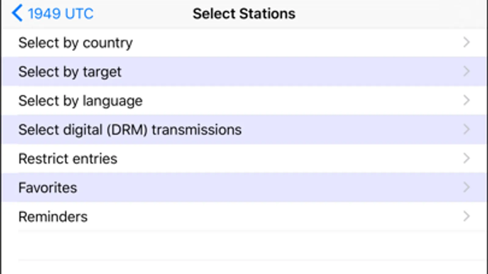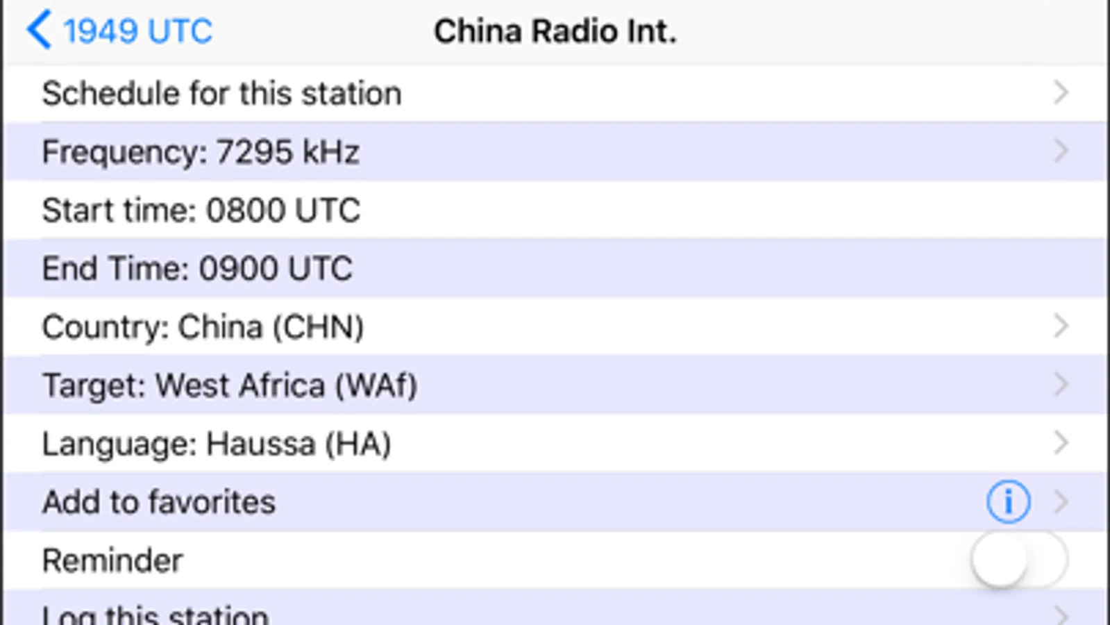 When viewing the details for a station, you can tap on the frequency, country, target, or language to get a list of all other stations with that matching value. You can also tap on Schedule to see all of the transmissions throughout the day for this station.