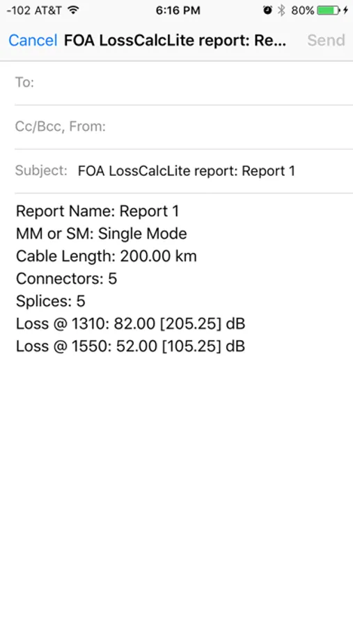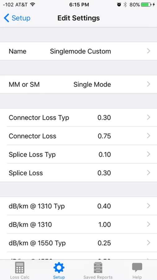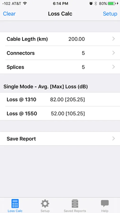 By choosing the type of link (singlemode or multimode) and specifying the length of the fiber and numbers of connections and splices, it will calculate the end to end loss of the link. The app has default specifications for singlemode and multimode links or the user may create custom setups with specifications appropriate for any application.